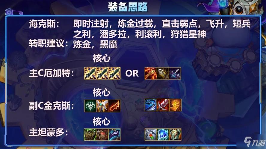 阵容推荐:厄加特、金克丝、蒙多、维克托、扎克、丽桑卓、沃里克、辛吉德、图奇 羁绊效果:9炼金 2枪手 2格斗 装备搭配 主C厄加特:三电刀/分裂+无尽+轻语 副C金克斯:复活甲、羊刀 主坦蒙多:反甲、狂徒 阵容解析:开局抢攻速,优先做电刀。