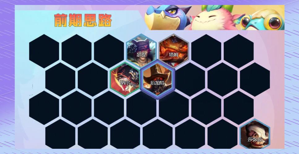 -4选秀,装备根据情况可以直接先做输出给到纳尔等舞者卡先打工过度用。中期运营 2-5到5,5人口继续补舞者或者乡村卡,但凡后续能凑羁绊和用的上的阵容卡都拿上。