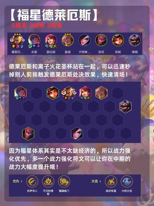 〖Four〗、在《金铲铲之战》游戏中,天选福星恭喜发财阵容的搭配并非固定模式,可以根据玩家获取到的棋子和装备进行灵活调整,但一般会围绕着福星羁绊以及具有较高输出能力或控制能力的英雄构建。
