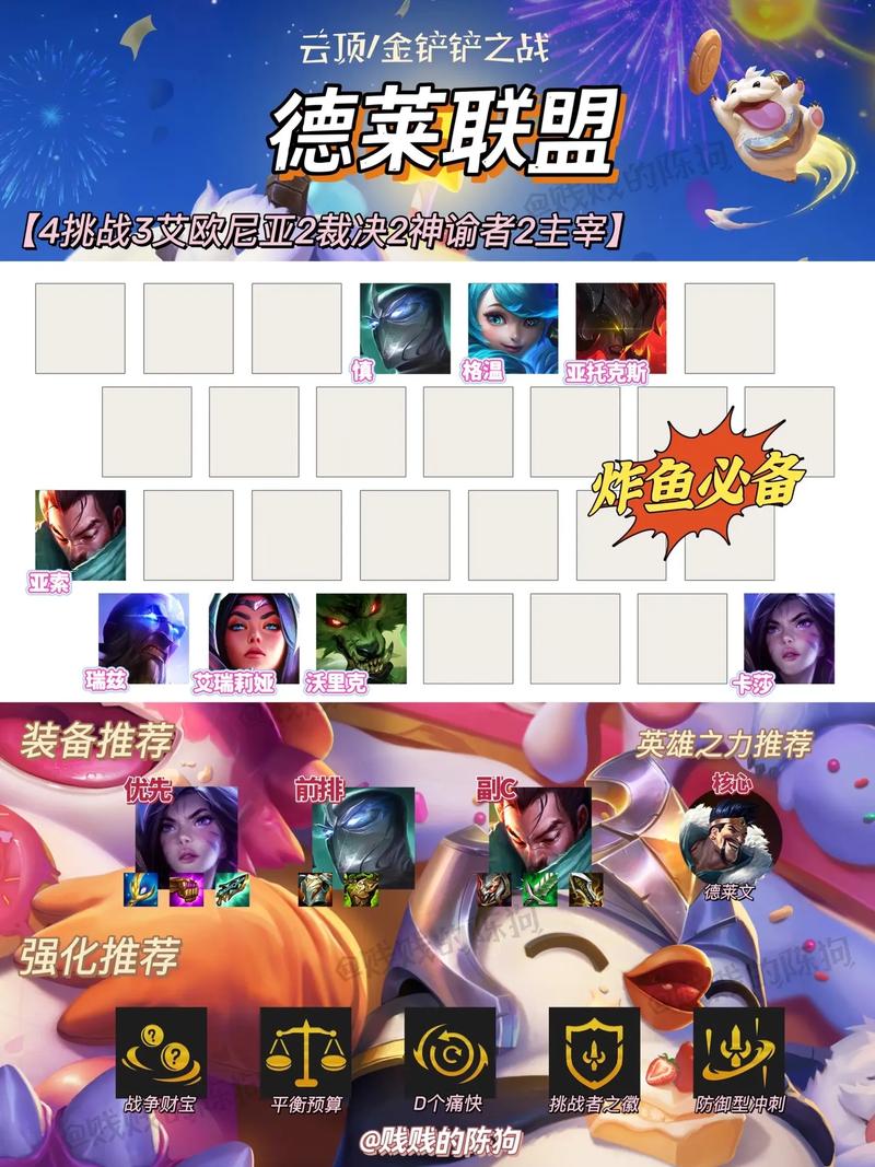 〖Four〗、金铲铲之战帝骑德莱文玩法攻略来啦! 阵容搭配 想要帝骑德莱文发挥最大威力,得找对朋友们哦!推荐阵容:钢铁领主、帝国之手、御界守、圣锤之毅、帝国之斧、冰川骑士、驭影双生、疾风剑豪。