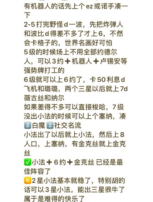 站位方面,一排能大范围攻击,注意防控制技能;二排适合针对忍刺,同样注意控制技能。阵容构建与搜牌节奏初期可以选取2-1上4人口,随后根据选秀结果升级人口。优先考虑女神之泪或金铲子,以形成2仙灵、2海克斯和3换形师的阵容。如果条件允许,灵活搭配2星棋子。