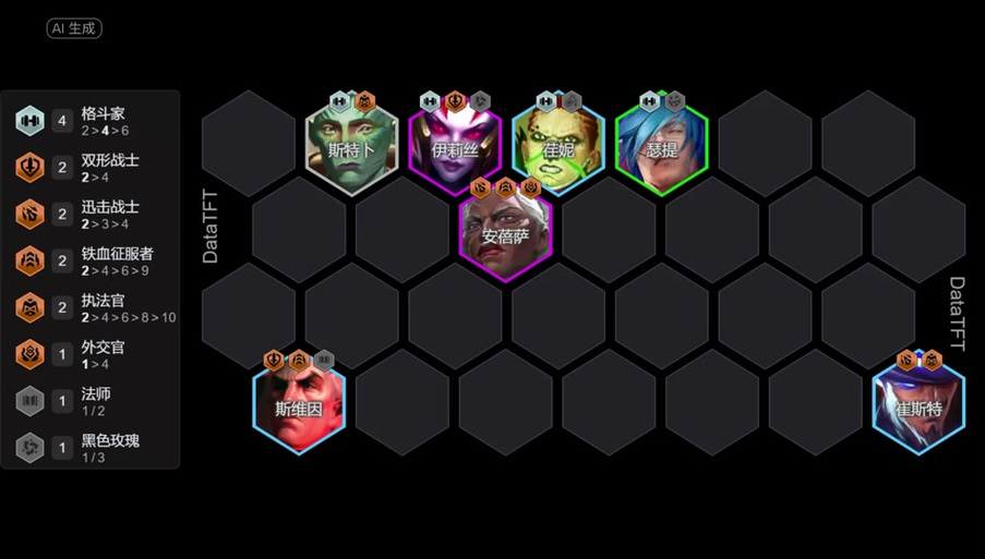 阵容搭配:腕豪、慎、凯隐、老鼠、斯维因、人马、霞、龙女。构成的羁绊效果是:9怒翼龙、2迅捷射手、2换形师、1龙神、1冒险家。配9怒翼和2迅捷射手,攻速拉满,不需要羊刀,给霞带纯输出装,伤害直接溢出。