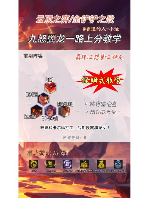阵容组成:4重骑兵,6神龙尊者,1冒险家,2幻镜龙,2怒翼龙。强化符文推荐:战力类:三费之力、鼓舞、见习英豪、飞升 功能类:神龙尊者纹章、阿福的百宝袋、神龙尊者学会、潘朵拉备战席/装备 阵容前提:前期任意阵容连胜过渡+装备合适(神龙尊者转职必备、饮血+正义组合比较好都有)。