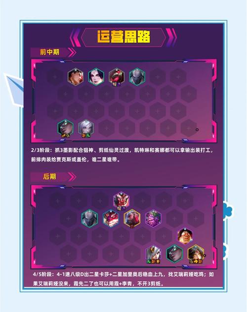 〖Four〗、前期的思路。尽量走连胜,或者稳血。有二星就上二星牌的羁绊,比如2星卡萨丁就上虚空刺过度,有2星豹女就用狂野换形过度,有2星蜘蛛就用仙灵刺过度,有2星剑姬或卡密尔就用3剑刺过度,如果没二星英雄就用斗士或骑士配合刺客过度,这里的刺客首选劫或卡特,记得不要上两个忍者,上一个就行了。