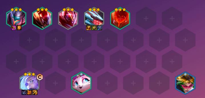 从上到下,从左到右)布隆、布里兹、机械甲虫、艾瑞莉娅、伊泽瑞尔、纳尔、艾克、奥莉安娜、萨勒芬妮。总结:刀妹是新赛季为数不多二星能稳定锁血的4费卡,技能目标打血量最低的单位,只要打死一个就可以一直 QQQ瞬秒脆皮,而且技能衔接也非常流畅,假赛概率很低。