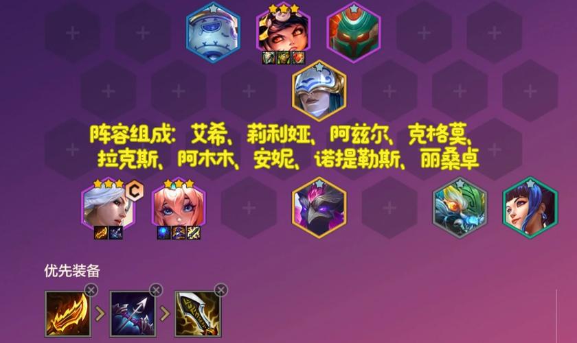 〖Four〗、护卫艾希阵容:羁绊组成:6护卫、3灵魂莲华、2狙神。这个阵容以艾希为主C,前排护卫肉盾坚实,后排艾希和辛德拉提供稳定输出。玩法要点:前期利用护卫羁绊的坦度和羊刀、科技枪等装备,让艾希在后排稳定输出。注意前排肉装的积累,以确保前排能抗住伤害。