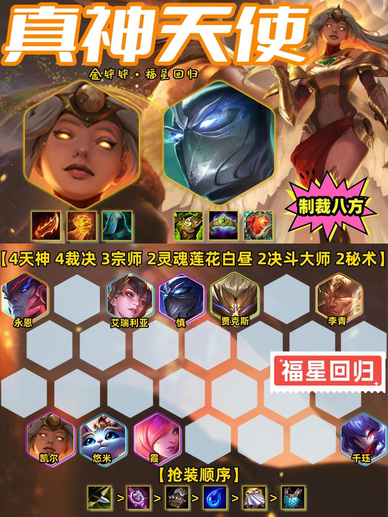 〖Four〗、金铲铲之战天选福星阵容推荐裁决天使阵容组成:永恩、刀妹、武器、盲僧、肾、猫、霞、千珏、天使。阵容强度:成型必吃分,质量够高能吃鸡。核心装备:羊刀、火炮、旗子(千珏/霞)运营思路:①弓开局的话尽量走连胜,装备不需要抢的情况下。②开局可以三国豹女带装备,也可以看天选走。