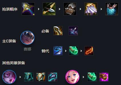 装备分配:纳尔核心装备:蓝BUFF+泰坦两件套。蓝BUFF保证无限投石,泰坦是纳尔的关键,类似贾克斯。无尽或饮血为纳尔的第三件装备最佳。塞纳装备:核心羊刀,物理输出装不挑,优先纳尔剩下的破烂,有强袭转职给塞纳即可。艾克装备:艾克若三星则给装备,核心冰心,打德莱文效果好,法衣和鬼书亦可。