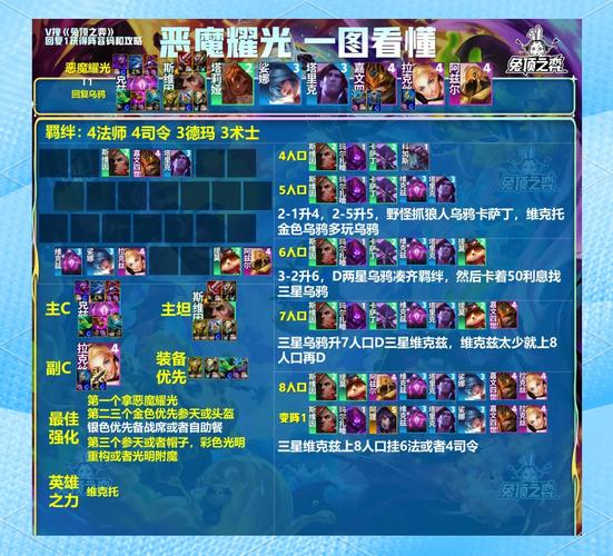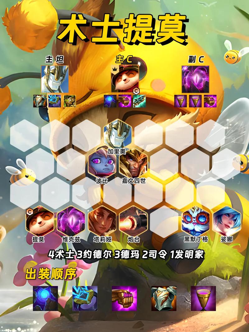 〖One〗、提莫的装备推荐包括蓝buff/青龙刀、法爆和科技枪。这些装备能保证提莫的技能连贯性和输出伤害。 战术运用 - 前期过渡:使用3约德尔人+3德玛西亚+2术士的组合过渡。由于前期有光明装备的支持,该阵容强度不俗。避免主动升级人口,而是逐步搜寻约德尔人,5或6人口时可适当搜寻以提升阵容质量。