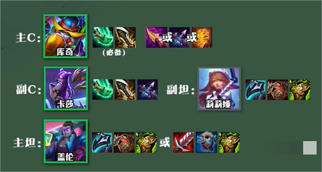 人口时,上潘森、双老鼠、双薇古丝、双阿木木。8人口时,根据赛季之星来选取搭配。装备分配:主C3星老鼠:推荐装备为红buff/羊刀、轻语、无尽/破防/巨杀。主C3星薇古丝:推荐装备为青龙刀、法爆、纳什之牙/帽子/破防。主T3星阿木木:推荐装备为坚定之心、狂徒、板甲、头盔。