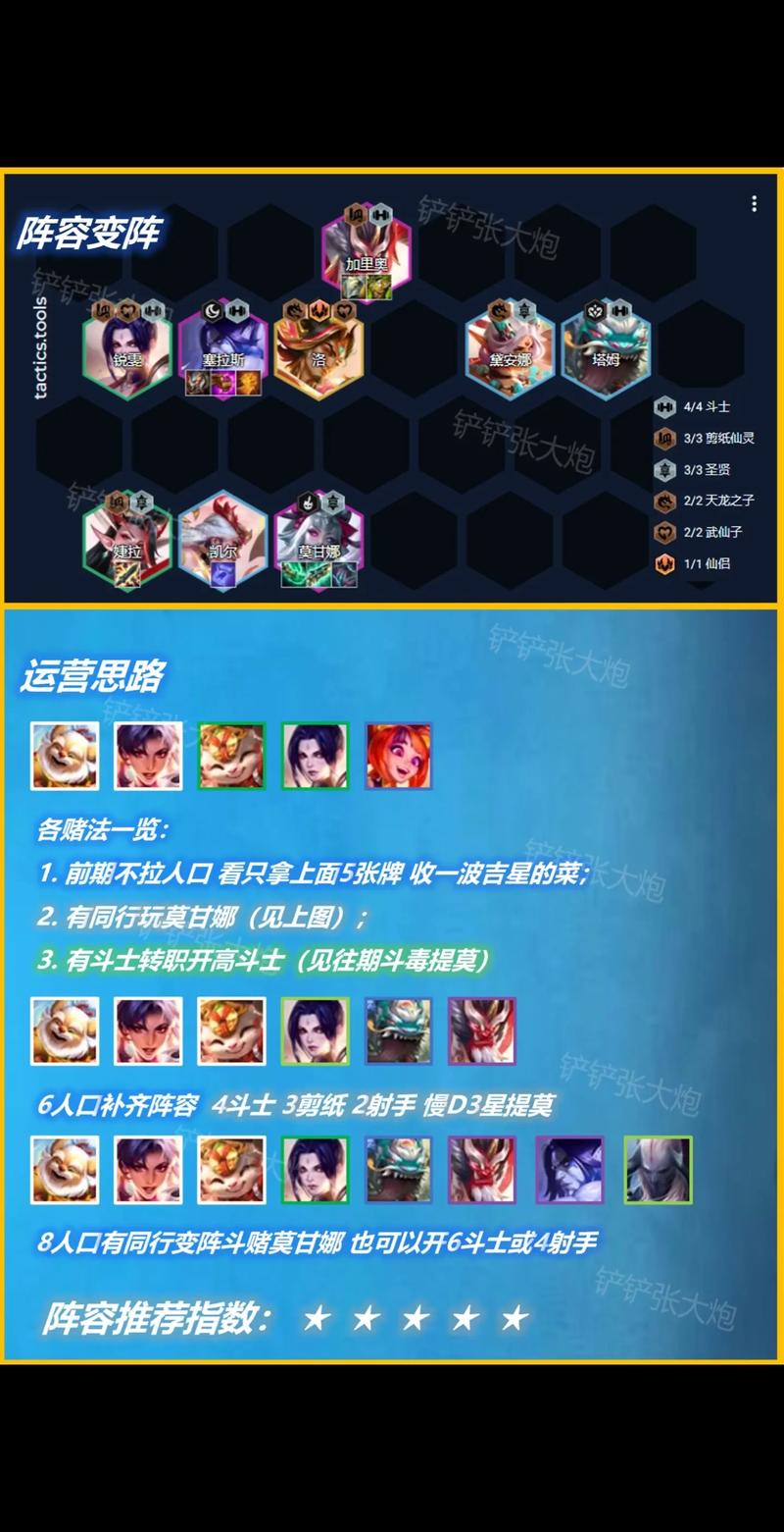 〖Two〗、狂野龙阵容 豹女、阿狸、卡牌、龙女、龙王、纳尔、猴子、潘森,这个阵容大家应该都耳熟能详。潘森和龙女是关键角色,龙王作为核心,一出手就能带走对面全部单位。尽管这个阵容有多种变种,不过最强势的还是以龙王为核心的配置。