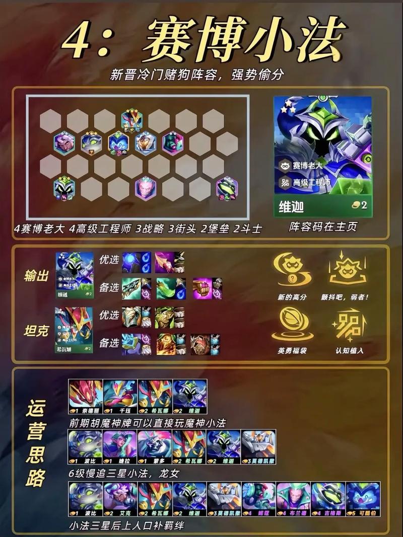 〖Four〗、《金铲铲之战》S14赌狗阵容推荐如下:阵容核心构成 主要英雄:烬、伊莉丝、希瓦娜、厄运小姐、阿萝拉、瑟庄妮、奈德丽、千珏。羁绊构成:4人造人、4魔装机神、2堡垒卫士,这是阵容的核心羁绊组合,能够大幅提升阵容的战斗力。强化推荐 优选:透体莲花I、星夜、备用零件。