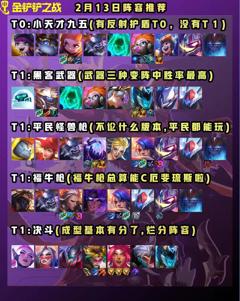〖Five〗、金铲铲之战S5阵容强度榜T0唯一真神:神龙努努开局金色海克斯或者彩色海克斯,有神龙纹章、神龙之魂、纹章之书、阿福的百宝袋(建议改名威朗普的百宝袋)无脑拿,没有直接d,拿到铲子有神龙转直接有分。