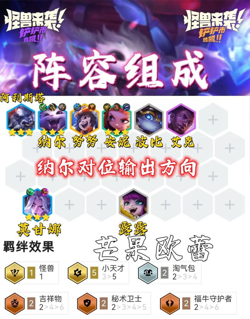 小天才九五阵容:阵容组成:佐伊+努努+安妮+厄加特+费德提克+蕾欧娜+阿利斯塔+波比+璐璐。羁绊组成:5小天才+1怪兽+1堕落使者+2福牛守护者+2吉祥物+2秘术卫士。秘术枪手阵容:阵容组成:莎弥拉+瑟庄妮+厄斐琉斯+厄加特+艾克+扎克+阿利斯塔+蔚。