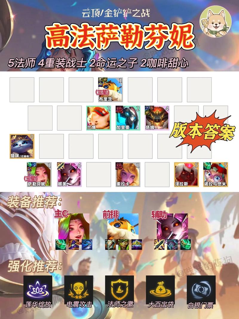 〖Three〗、金铲铲之战s5魔导萨勒芬妮阵容推荐【阵容介绍】萨勒芬妮有鬼书的情况下克制神龙尊者努努,质量不足时被怒翼龙霞克制。【阵容站位】站位一全员围绕萨勒芬妮站成一团,这样能令大家都吃到萨勒芬妮护盾,但这个站位比较害怕大成的霞,面对霞体系的时候可以分散站。