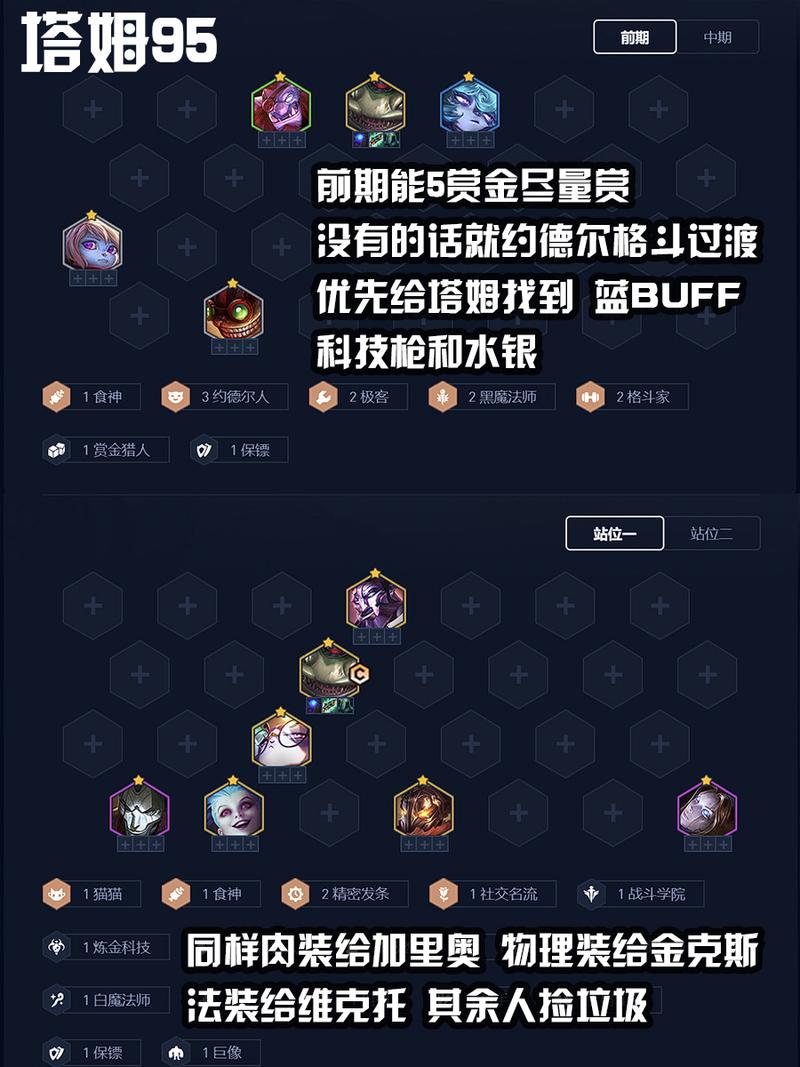 首先是名流巨像卡莎阵容。该阵容包括塞恩、加里奥、卡莎、风女、撒勒芬妮、猫咪和宝石。此阵容拥有3社交名流、1猫猫、2巨像、2白魔和2学者羁绊。在前中期过渡阶段,我们应尽量选取最强战力进行连胜。前期留牌主要考虑对子和青钢影、男刀、乌鸦、巨魔等高战力单卡。