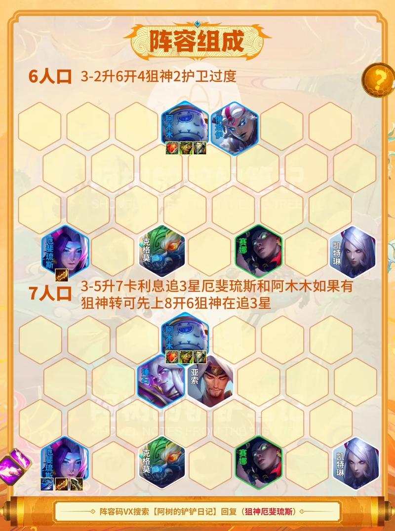 阶段:3-2升6人口,优先补充2刺客+2射手+2布卢姆,同时小搜确保二星图奇和二星后卫,稳定阵容质量。后续搜索三星图奇和三星绽放。4阶段:7人口,优先补维鲁斯,开三个快射手,如果未搜到三星布隆且有布隆同行,可准备补艾达丝。5阶段:8人口,布夏开四速射手,搜索三星戴安娜和三星维鲁斯。