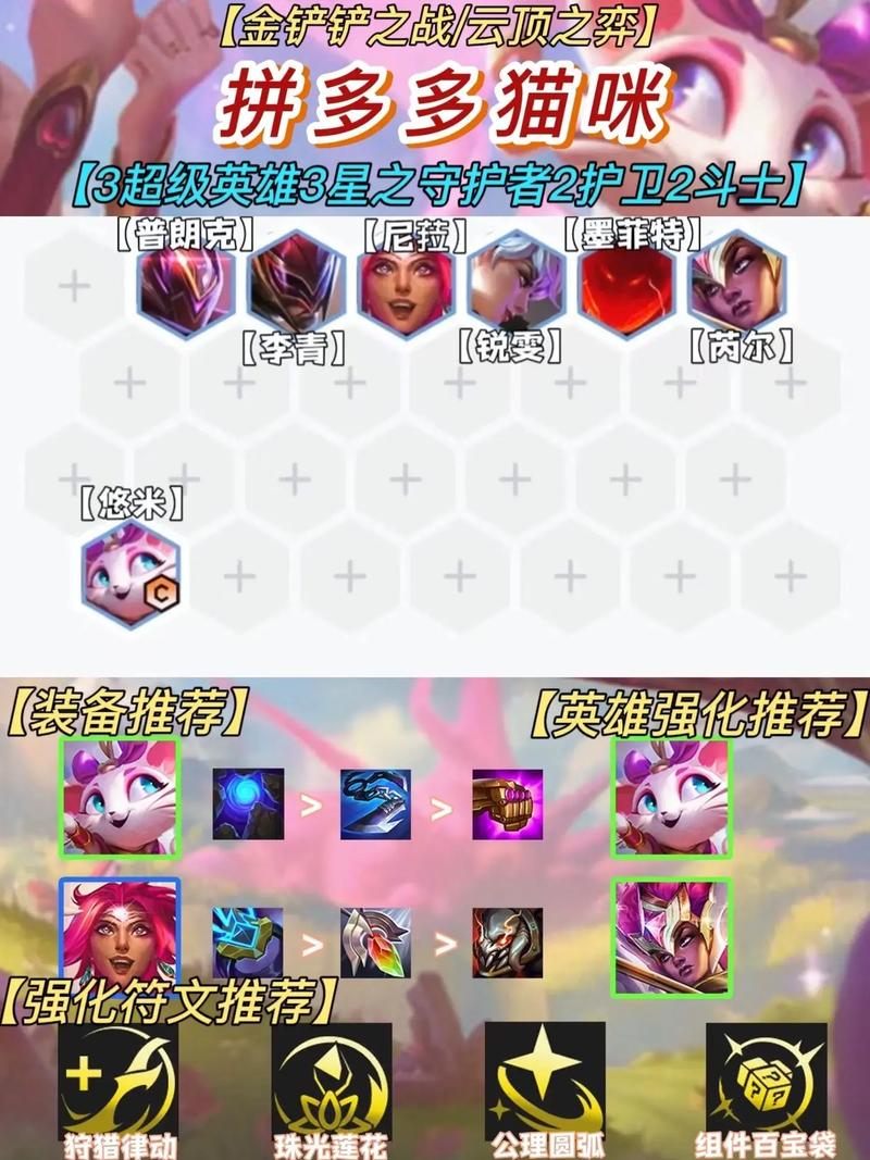 〖Three〗、吉祥物璐璐阵容攻略阵容组成阵容站位站位一第一排站肉盾,最后一排放置可爱的喵咪和露露。装备推荐优先做露露的蓝buff和法爆,然后做加里奥的肉装。搜牌节奏打完第一波野怪,3-1开始搜卡,主要搜3星露露和加里奥,最后把1,2费卡都搜成3星。
