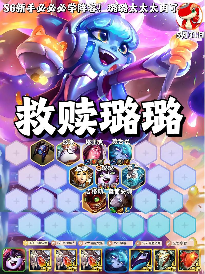 首先说说斗法璐璐的阵容组成:璐璐、雷克赛‘、猴子、狐狸、卡牌、南天之怒、大虫子、纳尔、小法。这套阵容对三星需求较多,也可以说是一个赌狗阵容了把,除2个4费棋子其他均可追三星,依靠3星质量取胜。主C仙灵女巫装备推荐:大天使之杖、青龙刀、大天使之杖。