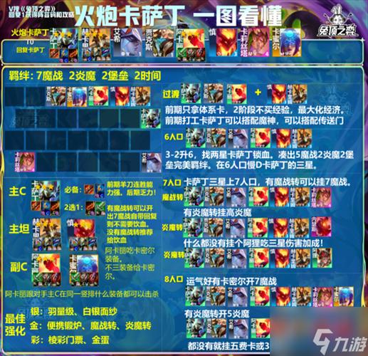 首先是名流巨像卡莎阵容。该阵容包括塞恩、加里奥、卡莎、风女、撒勒芬妮、猫咪和宝石。此阵容拥有3社交名流、1猫猫、2巨像、2白魔和2学者羁绊。在前中期过渡阶段,我们应尽量选取最强战力进行连胜。前期留牌主要考虑对子和青钢影、男刀、乌鸦、巨魔等高战力单卡。