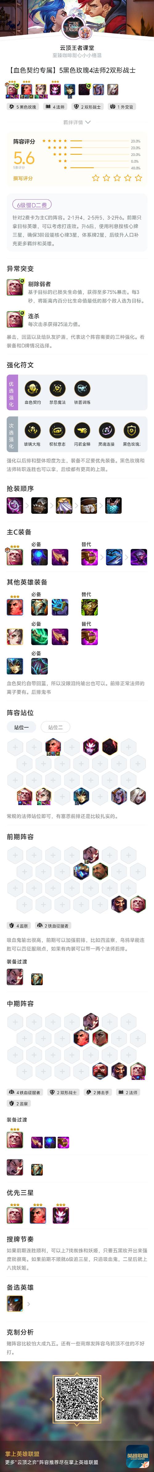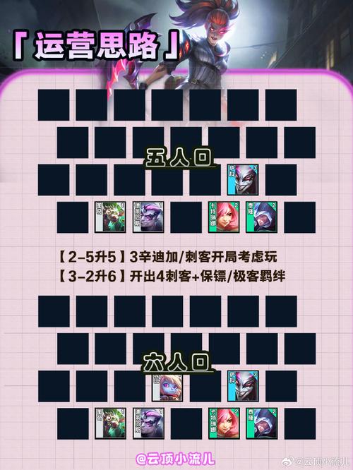 首先,5黑玫九五阵容被提及为强度比较高的运营阵容之一。这套阵容以黑玫先知和蚂蚱为核心,蚂蚱作为5费卡,在8人口时若能D到1星蚂蚱并搭配足够的前排质量,便能稳定过渡到9人口。此外,阵容中的其他角色如盖伦或乌鸦等,也能在特定情况下发挥重要作用。其次,6极客阵容也备受推崇。