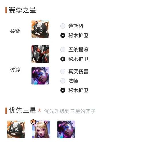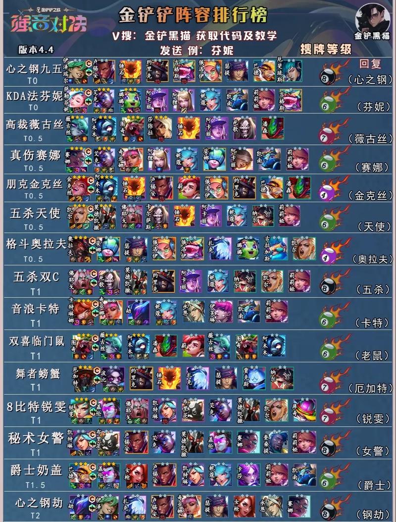 〖Five〗、《金铲铲之战》S10版本上分阵容推荐如下:超粉狐狸 阵容特点:版本最强的运营阵容,需要玩家根据不同的天选灵活搭配羁绊。核心英雄:狐狸,单体伤害高,如果有真实伤害转职装备更佳。天选推荐:阿卡丽或劫,超粉羁绊提供吸血效果,增强前排坦度。