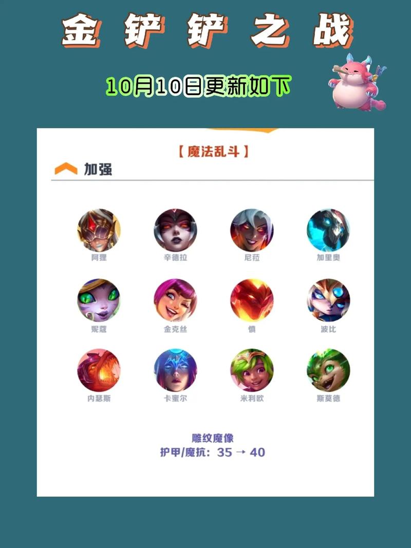金铲铲之战17版本更新内容主要包括以下几个方面:英雄调整 薇古丝:技能伤害提升,次要伤害降低。卡蜜尔:攻击力提升。吉格斯:主要技能伤害提升。普朗克(近战):法力值降低,施放技能更快。努努和威朗普:法力值降低,施放技能速度加快。斯维因(近战):每秒治疗量提升。