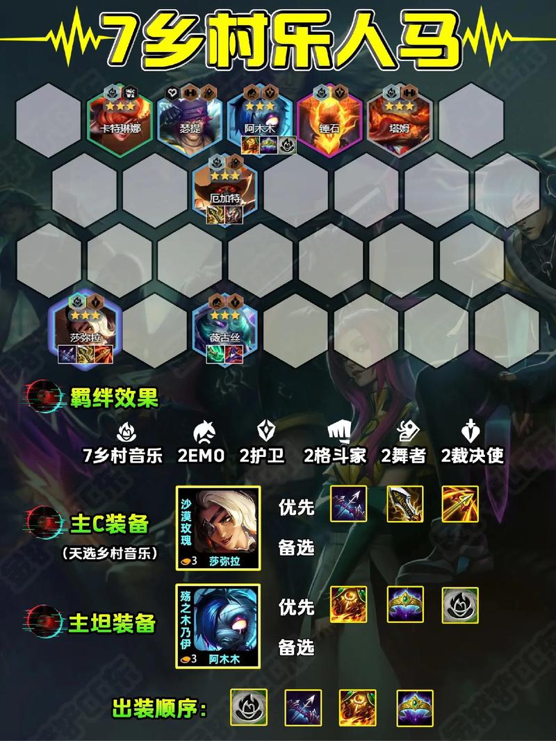 主宰尼菈核心为6主宰羁绊,需主宰文章纹章支持。尼菈必做火炮,沙皇副C需纳什之牙+法爆,狗头携带薄暮法袍提升尼菈输出。过渡依赖2主宰2挑战2祖安,打工核心为金克丝+狼人+莎弥拉,优先连胜。崔斯特传说之力强化装备获取,城邦优先选经济类。