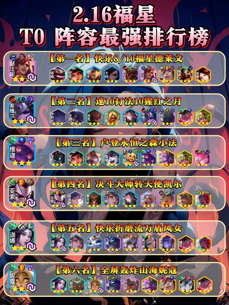 〖Five〗、在金铲铲之战福星版本中,最强阵容推荐及轻松上分攻略如下:阵容推荐:六福星+三三国武将 六福星羁绊:这是福星版本中的核心羁绊,能够提供极高的经济收益,帮助玩家在游戏中后期拥有更强大的战斗力。