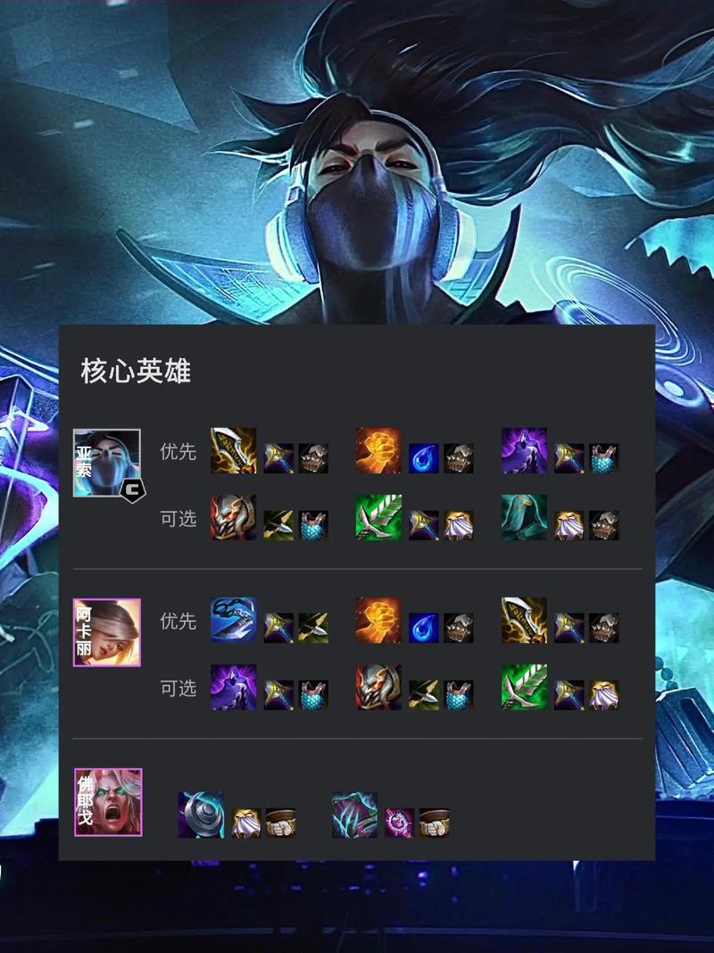 〖One〗、主C亚索:核心装备:泰坦(反曲弓+锁子甲),提供攻击力、法强和双抗,叠加速度快,适合亚索的高攻速特性。输出装备:法爆(无用大棒+拳套),提升技能伤害。续航装备:科技枪(暴风大剑+无用大棒),由于“浪客之风”不再提供全能吸血,科技枪成为首选续航装备。备选装备包括破防者、正义等。