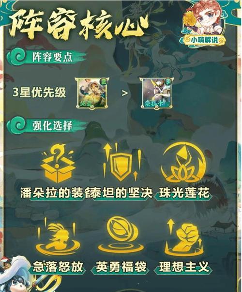 〖Three〗、阵容构建推荐羁绊组合:5星之守护者、2福牛守护者、2秘术卫士、2爱心使者、2吉祥物、2灵能使和1怪兽。关键在于,需要芮尔的强化符文-分享驭铁术,这会为友军的技能施放提供额外的双抗加成,特别是那些技能释放频繁的英雄,如卑尔维斯,他拥有S8最短的蓝条。