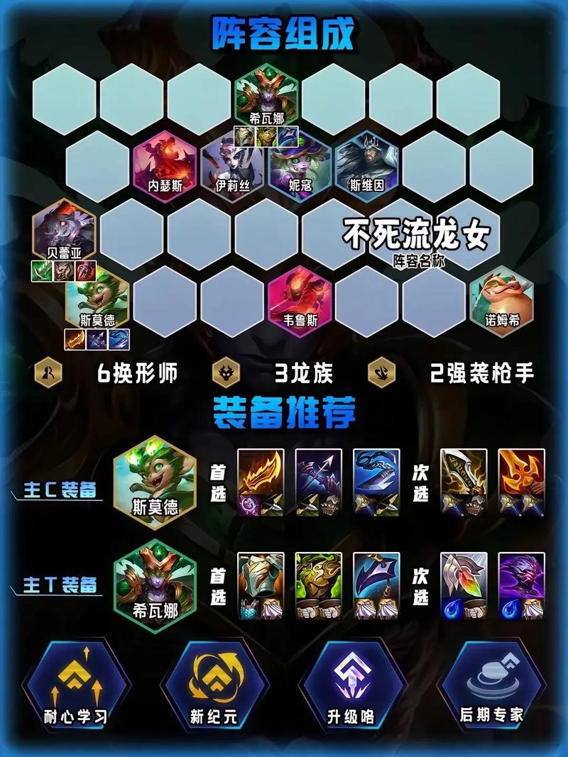 核心英雄:龙女、纳尔、蜘蛛、乌鸦。这些英雄是换形师羁绊的关键,可以变形并提供强大的输出和坦度。次要英雄:豹女、腕豪、杰斯。这些英雄可以补足阵容的输出和控制能力,使阵容更加完善。装备推荐 龙女装备:推荐龙牙(提供魔法抗性)、反甲(反弹物理伤害)、饮血剑(提供吸血能力)。