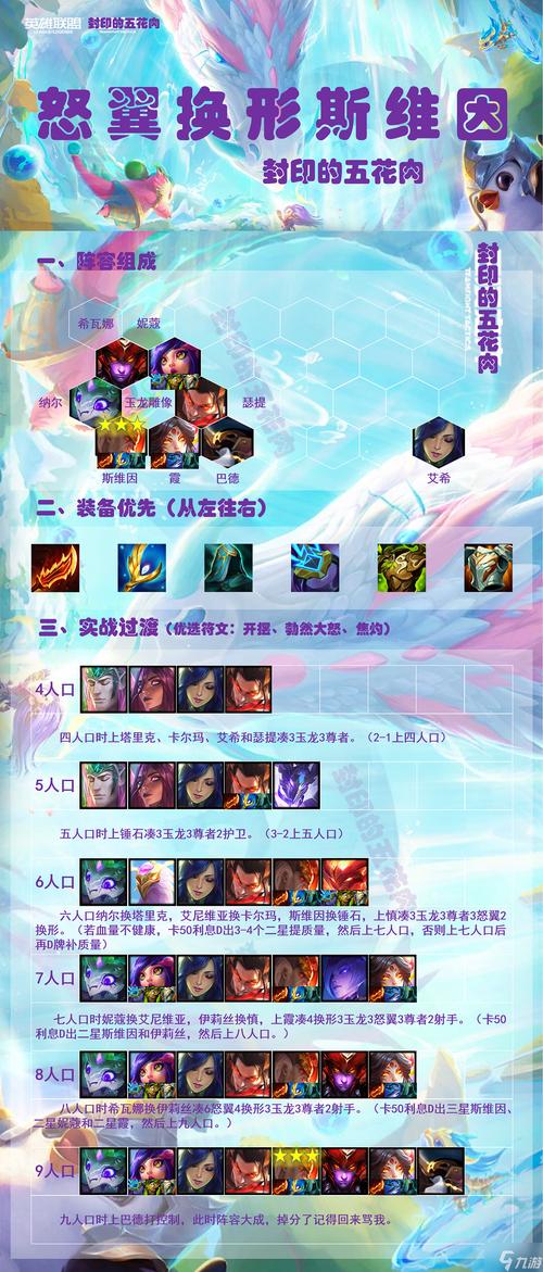 前排顶住并注意调整人马占位。没有轻语时,图奇与霞站同一侧。 运营节奏: 前期:提升质量,采用二斗二射组合,中期补重骑开风暴,保持连胜。 八级:形成五射两重骑阵容。 九级:重骑换龙女,开出四怒二换型阵容。以上是金铲铲之战s5迅捷怒翼霞的玩法攻略,希望对玩家有所帮助。