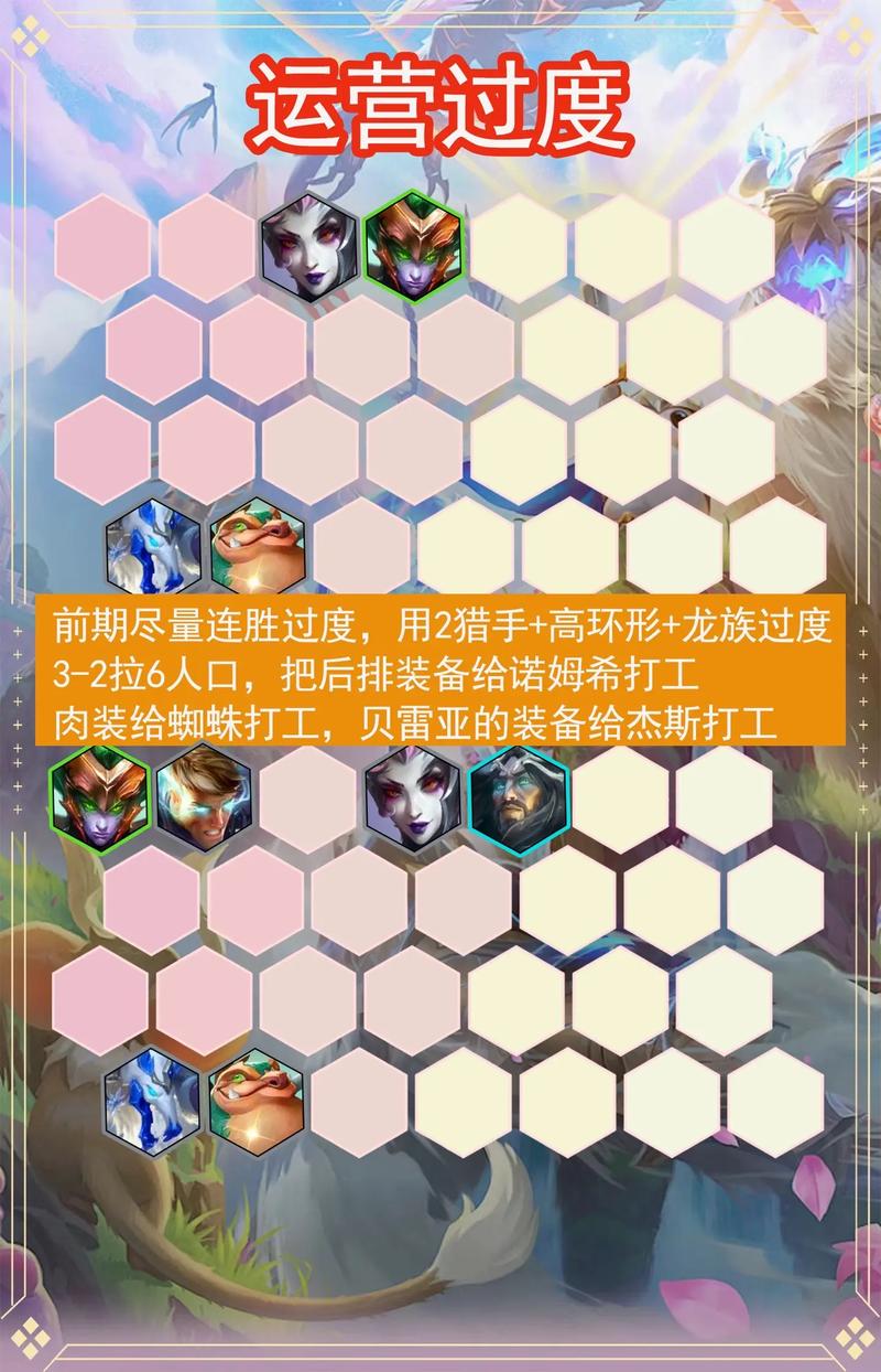 玩法简析中,连胜是九五至尊阵容的核心策略。过渡阶段,推荐使用豹女三国天选+皇子+蜘蛛+提莫的组合,以3三国2神盾2神射为过渡阵容。根据棋子质量,适时提升人口等级,保持阵容的战斗力。在前中期,过渡阵容的选取并不唯一,根据棋子质量灵活调整。