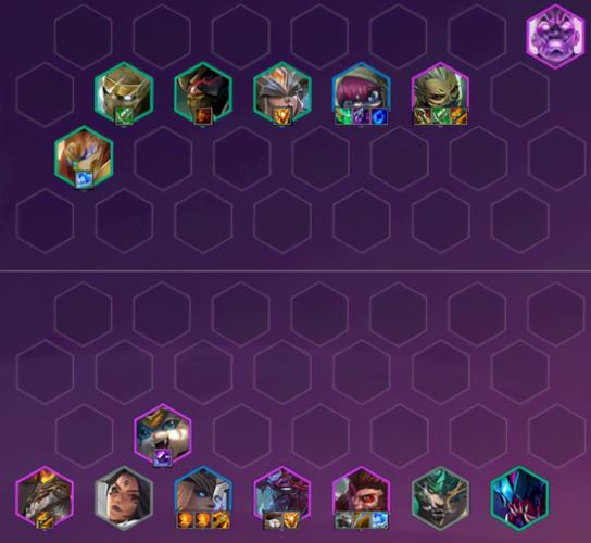 阵容搭配阵容基础包括:卡萨丁『1』、艾瑞莉娅『4』、雷克赛『2』、科加斯『3』希维尔『4』、卡兹克『4』、卡莎『5』、玛尔扎哈『3』羁绊组合:7变异、2格斗、3强袭、1巨像。装备选取主C:战争女神 - 希维尔,装备推荐变异转金铲铲+负极斗篷,配合超级肾上腺,强化平A输出。