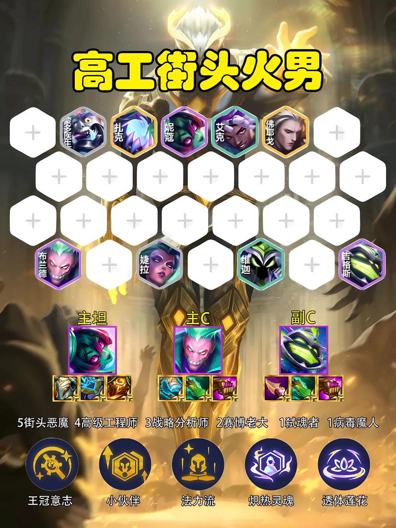 〖Three〗、核心英雄:布兰德(火男)、妮蔻、金克丝、莎弥拉、可酷伯、吉格斯、艾克、蒙多医生、婕拉。羁绊组合:7街头恶魔、3战略分析师、2高级工程师。强化推荐 优选:街头恶魔之冕:提升街头恶魔羁绊的效果,增强火男的输出能力。自由发挥:提供额外的装备选取,增加阵容的灵活性。