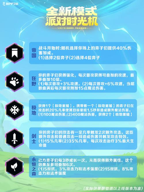 〖Two〗、金铲铲之战的派对时光机模式是在2024年12月27日开启的。这个新模式为玩家带来了全新的游戏体验,其中包括了以往赛季的羁绊返场,让玩家能够搭配出更有趣的羁绊组合。派对时光机模式不仅仅是对旧赛季的回顾,更是一次全新的策略挑战。玩家需要在这个模式中灵活选取羁绊,以最大化自己的对局优势。