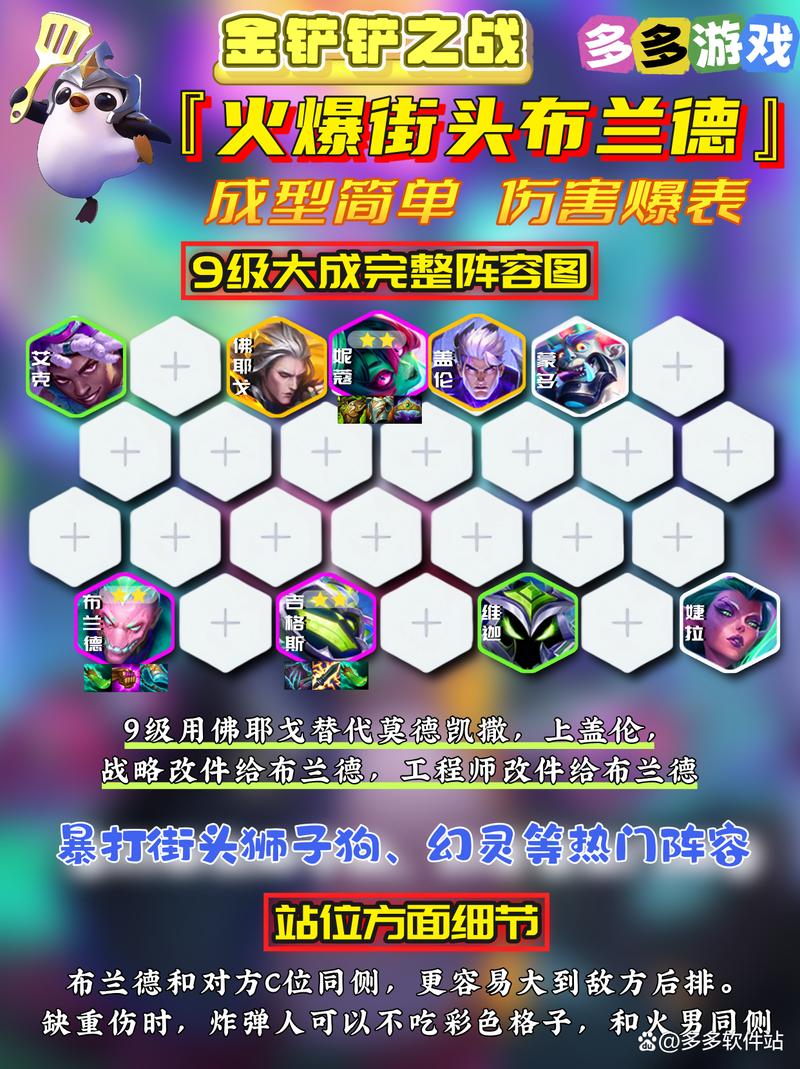 金铲铲之战s14街头布兰德阵容搭配推荐如下:阵容组成 核心英雄:火男(主C)、炸弹人、妮蔻、可酷伯、佛耶戈、莎弥拉、铁男、艾克、婕拉。羁绊组成 关键羁绊:1弑魂者、5街头恶魔、4高级工程师、3战略家、2赛博老大、2斗士。这些羁绊能够大幅提升阵容的整体战斗力和灵活性。