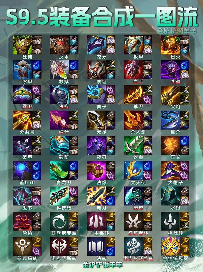 〖Three〗、暗星之心,合成公式:金铲铲+拳套,携带者也是一名暗星。刺客的利爪,合成公式:金铲铲+反曲之弓,携带者也是一名刺客。圣盾使的胸甲,合成公式:金铲铲+巨人腰带,携带者也是一名圣盾使。爆破专家的电荷,合成公式:金铲铲+无用大棒,携带者也是一名爆破专家。