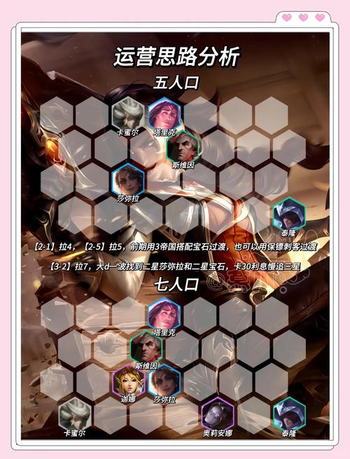 为了提升前排的生存能力,可以搭配双保镖,例如二星赛恩或巨像,其中赛恩的控制效果尤其出色。不过,推荐优先考虑五帝国阵容,这样可以最大化发挥莎弥拉的输出能力。同时,宝石和发条的选取也是根据需要,宝石能增加名流伤害,发条则提供控制和白魔效果,整体上这套阵容的卡牌竞争压力较小,更容易形成优势。