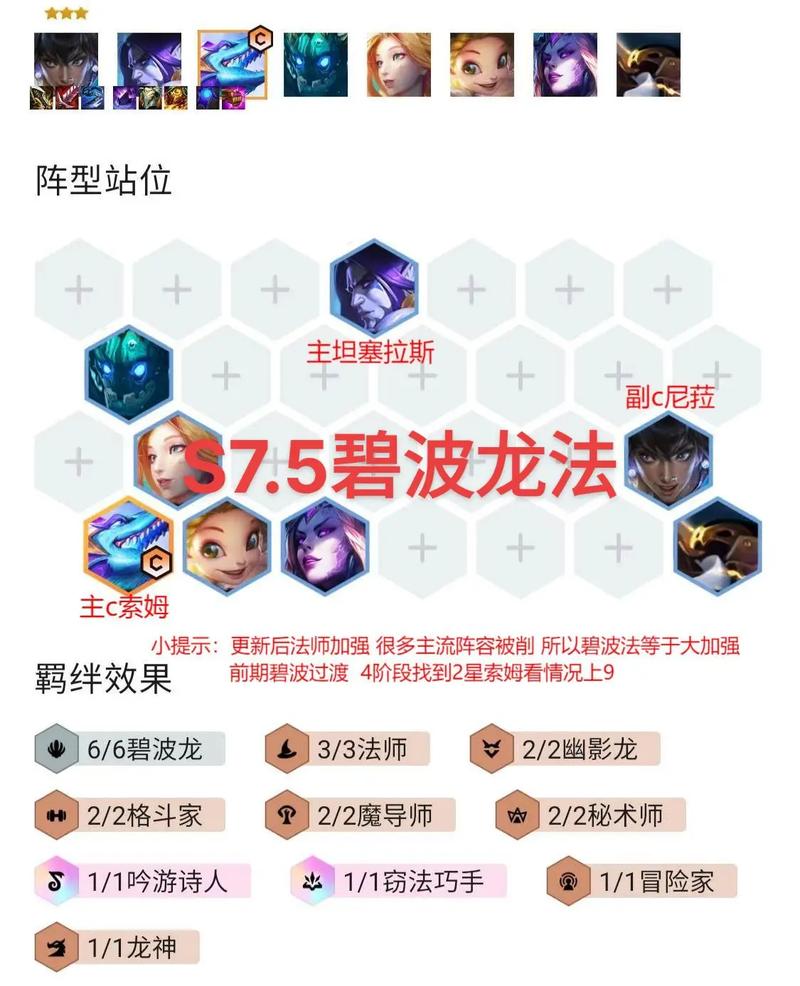 〖Three〗、金铲铲之战s5碧波格斗法师阵容搭配详情如下:阵容介绍 大成型碧波龙阵容,后期具有极高的战斗力,吃鸡率很高。阵容站位 索姆:一般和对面C位站对角,以最大化其技能伤害范围。 萨勒芬妮:技能范围是2格,放在倒数第二格可以最大化其覆盖范围。 墨菲特:携带传送门可以防刺客,保护后排。