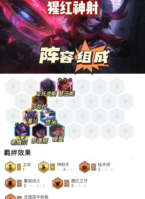 首先,阵容组成以薇恩为核心,搭配锤石、烬、锐雯、蛇女、剑魔、莉莉娅(若有夜幽转职则8级成型,无需莉莉娅)、沙皇、基兰,形成6灵魂莲华夜幽、3腥红之月、2神射手、2重装战士、2秘术师、2神盾使、1袅雄的组合。