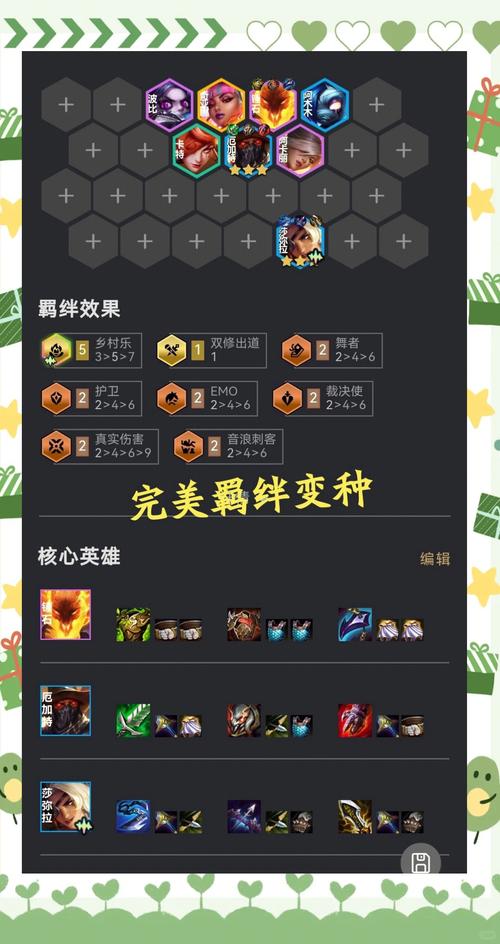 为了提升前排的生存能力,可以搭配双保镖,例如二星赛恩或巨像,其中赛恩的控制效果尤其出色。不过,推荐优先考虑五帝国阵容,这样可以最大化发挥莎弥拉的输出能力。同时,宝石和发条的选取也是根据需要,宝石能增加名流伤害,发条则提供控制和白魔效果,整体上这套阵容的卡牌竞争压力较小,更容易形成优势。