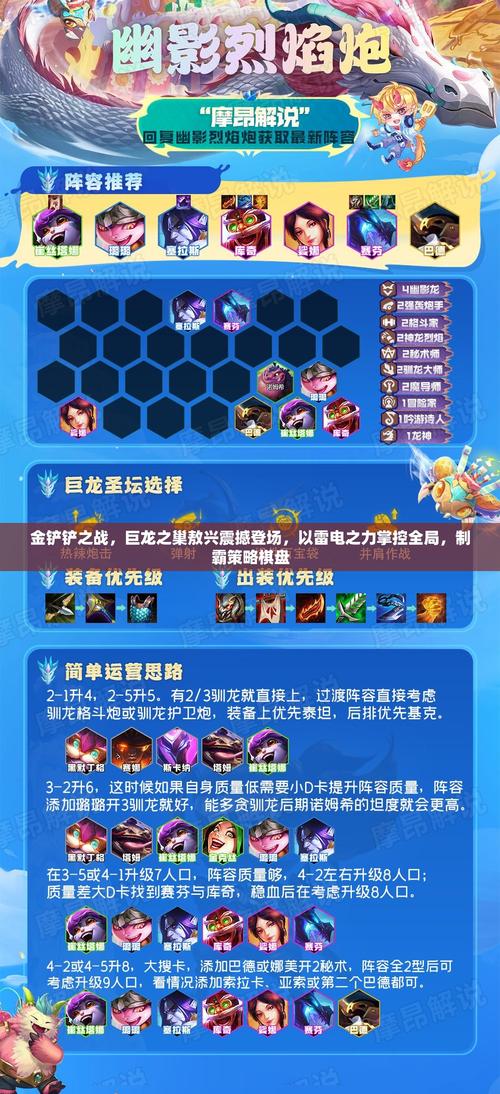 〖Two〗、金铲铲之战S5新赛季超强阵容搭配指南如下:星界龙阵容 核心英雄:星界龙。搭配高费卡如索拉卡和努努,形成强大的输出与控制能力。羁绊效果:星界龙羁绊能够提供额外的生命值和法术强度加成,使阵容在中期展现极强战斗力。装备推荐:优先合成蓝BUFF和大天使之杖,提升核心英雄的技能释放频率和伤害。