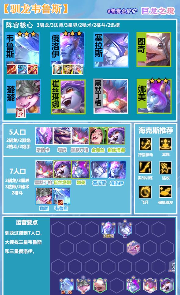 〖One〗、金铲铲之战驯龙索尔版本之子玩法解析如下:核心羁绊选取:驯龙龙王:当前版本中,龙王体系的强度与热度均超越敖兴,成为驯龙羁绊中的佼佼者。龙王可搭配的羁绊主要有两种:九阶星界和驯龙魔导。九阶星界:若能大成,其散件掉落丰富,上限极高,但运营难度也大,需实力与运气并存。