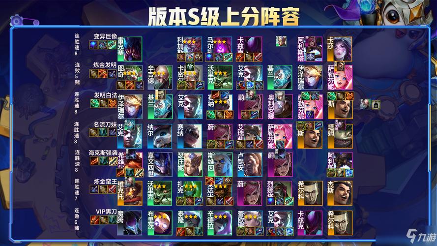 《金铲铲之战》S5霓虹之夜上分阵容推荐变异巨像这套阵容与双城版本变化不大,依然是以玛尔扎哈(蚂蚱)与科加斯(大虫子)为核心,如果螳螂来的早或又刺转也可考虑螳螂主C。测试服最近更新现阿利斯塔(牛头)双抗大增强,哪怕无装备都可稳定释放技能,坦度极其优质。