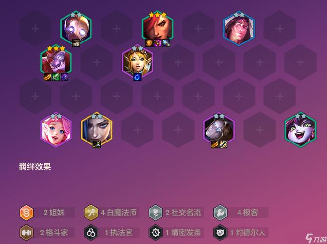 〖Four〗、阵容与羁绊搭配 阵容搭配:希维尔、牛头、乌鸦、卢锡安、蔚、猪妹、皇子。这个阵容以希维尔为核心输出,其他英雄则提供控制和坦度。羁绊搭配:6海克斯科技、2执法官、2强袭战士、2格斗家、1巨像、1宿敌。其中,6海克斯科技是核心羁绊,能大幅提升阵容的输出能力。