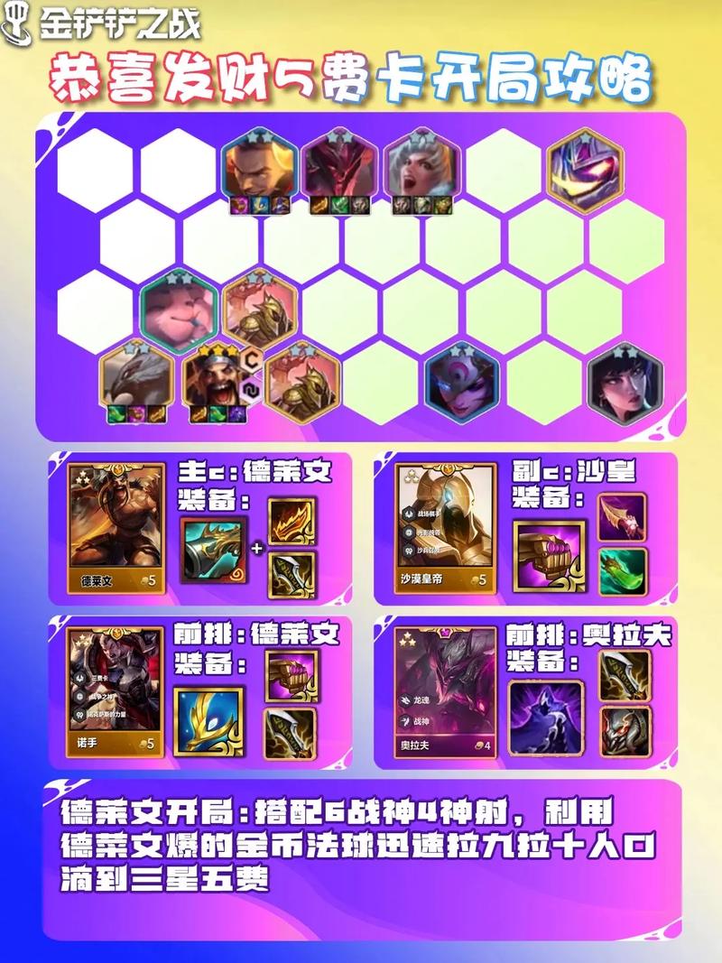 金铲铲之战s5恭喜发财模式玩法攻略如下: 阵容组成与羁绊 阵容:推荐九五至尊阵容,该阵容强度高,灵活性强。 羁绊:根据开局五费卡选取对应羁绊,如奎桑提则选取堡垒羁绊。 符文强化与装备选取 符文强化:优先选取经济类符文如常客优惠、利滚利,以及皮尔特沃夫相关符文如皮尔特沃夫之心、刀下取金。