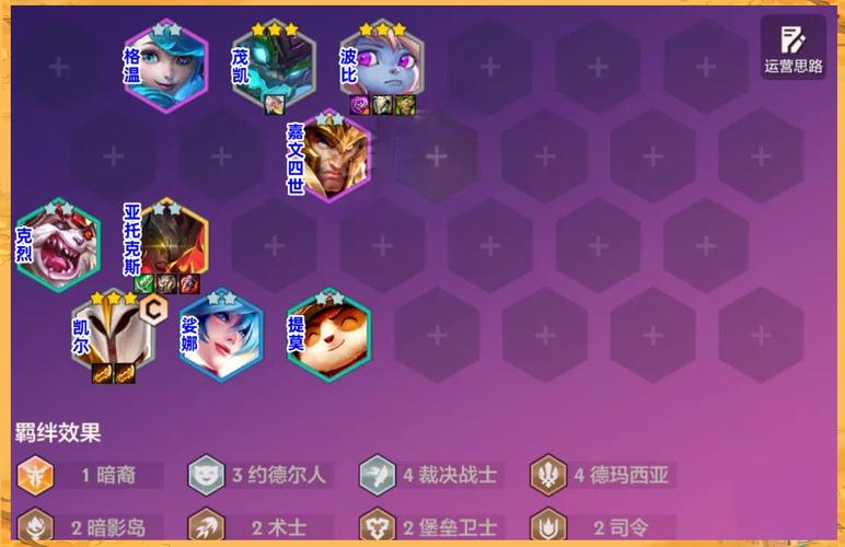 提莫4星后上人口,7人口可以先上皇子,8人口下皇子上塔莉垭、维克兹开4术士。『4』阵容解读:近来测试服最强势无脑的赌狗,成型基本前2!开服上分首选阵容。阵容需要在6级D提莫3星以及两个以上3星(比较好是加里奥和乌鸦),让提莫变成4星。