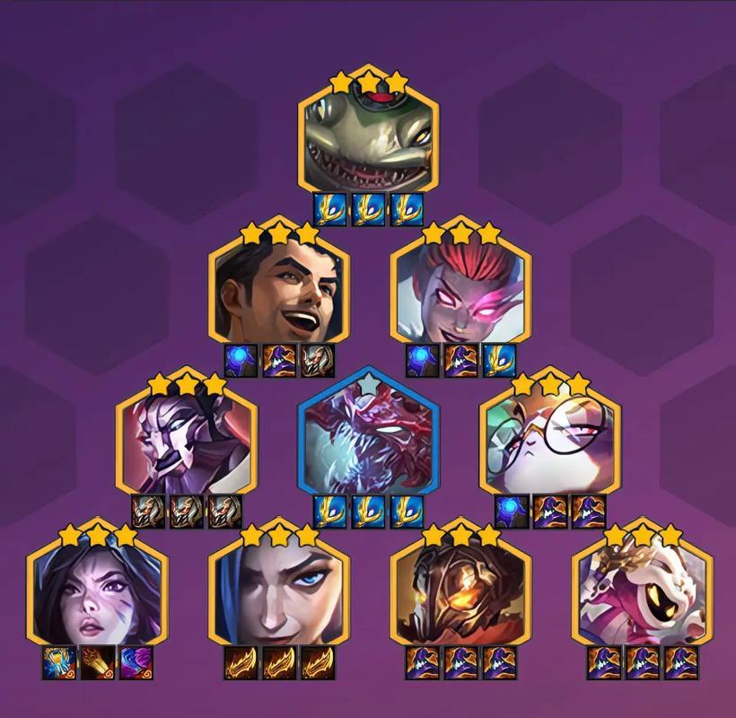 格斗维鲁斯:韦鲁斯、俄洛伊、塞拉斯、奥恩、EZ、赛芬。这套阵容成型速度很快,属于快攻吃烂分卡组。利用快速三星的高质量牌组,在前期就能取得连胜,运营和过渡相对简单,非常适合新手玩家。一打九顶级乌鸦:乌鸦、纳尔、龙女、艾希、瑟提、妮蔻、霞。